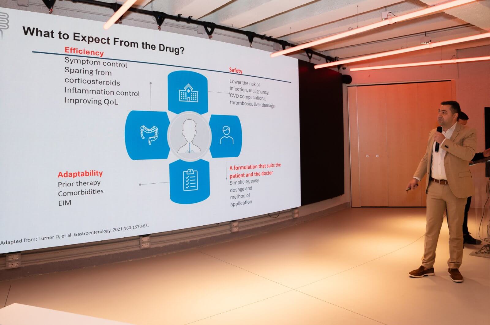 Na skupu u Tirani fokus prezentacije Dr Markovića bio je na primeni leka Vedolizumab kao dela savremene strategije u lečenju IBD. Ovaj biološki lek iz grupe monoklonskih antitela blokira protein na površini belih krvnih zrnaca koji je povezan sa zapaljenjem u crevima. Time dovodi do smanjenja zapaljenja, pokazujući izuzetne rezultate u lečenje kako umerenog, tako i teškog stanja ulceroznog kolitisa i Kronove bolesti.